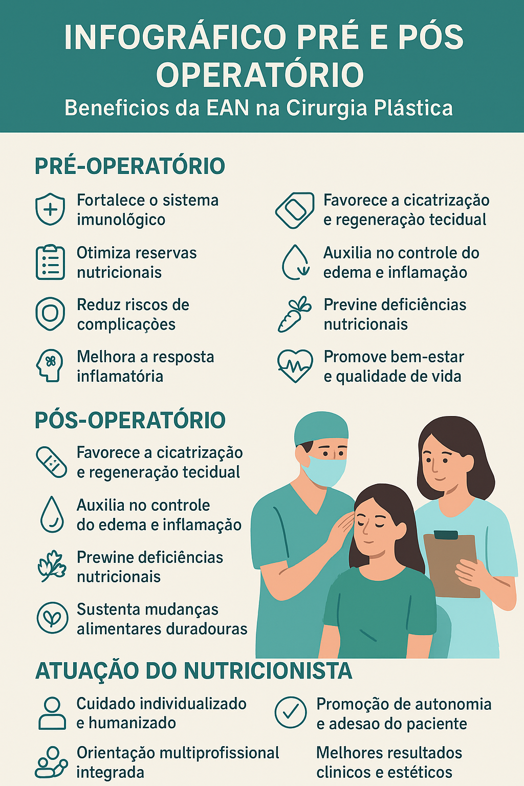 Material visual que apresenta os principais benefícios da Educação Alimentar e Nutricional na cirurgia plástica.